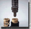 Heat Staking involves the controlled flow of molten plastic to capture or retain another component, usually of a different material. Heat Staking is beneficial when joining two parts that consist of different material which cannot normally be ultrasonically welded. Heat Staking is also a cost effective way to bond when simple mechanical retention of one part to another is adequate (as opposed to molecular bonding). The attachment of metal to plastic is the most commonly used application. A hole in the metal parts is combined with a pre-molded plastic boss. A thermal tip makes contact with the plastic boss and creates localized heat. The light pressure from the thermal tip configuration melts the plastic boss into a predetermined shape. When localized heat is removed, the plastic material solidifies and the different material are fastened together. |